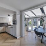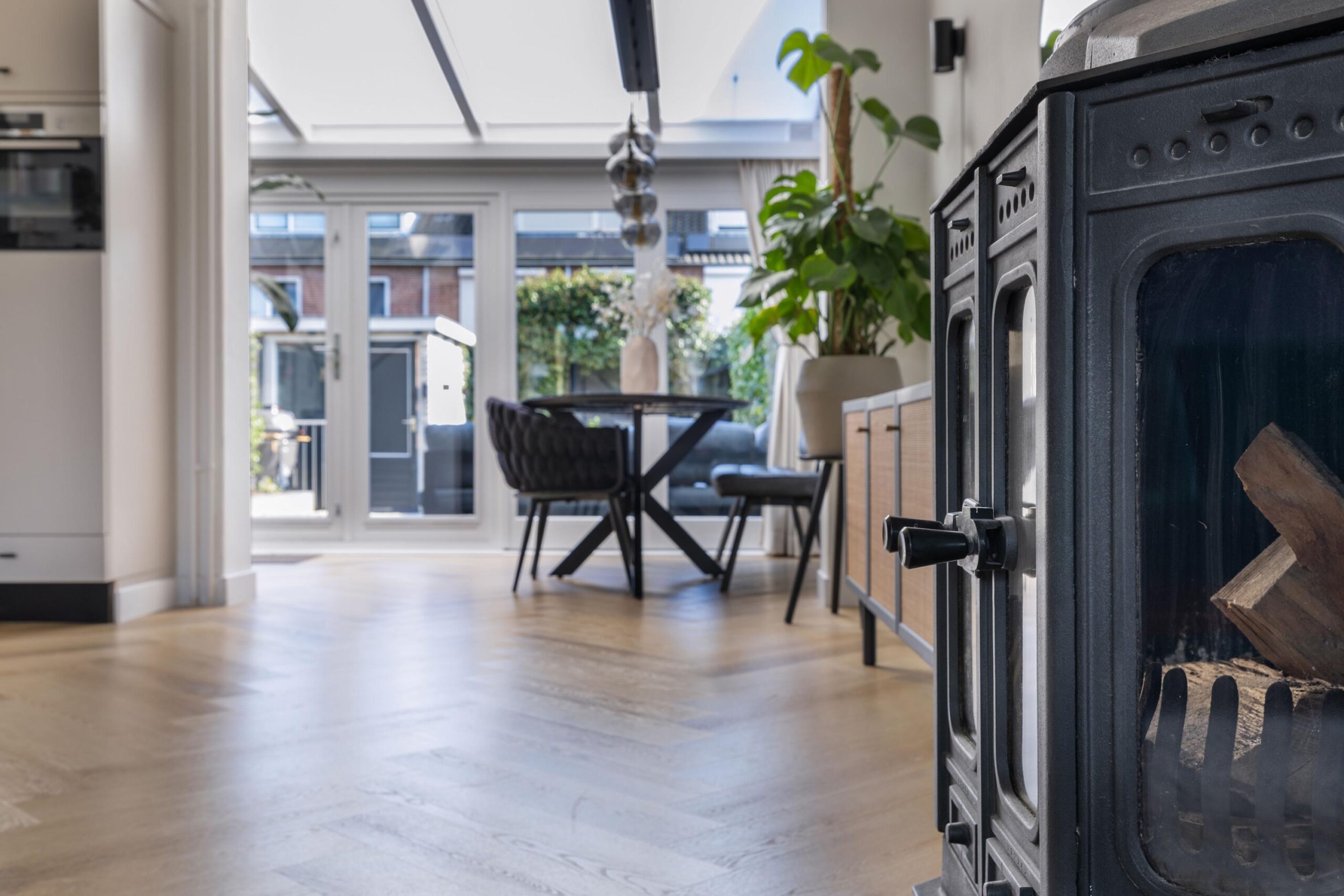 De lichte en sfeervolle woonkamer is uitgebouwd en afgewerkt met een prachtige visgraatvloer en strak gestucte wanden. De houtkachel zorgt voor extra sfeer en warmte. Aan de achterzijde bevindt zich de aangebouwde serre met vloerverwarming, waardoor dit een heerlijke plek is om het hele jaar door te genieten.