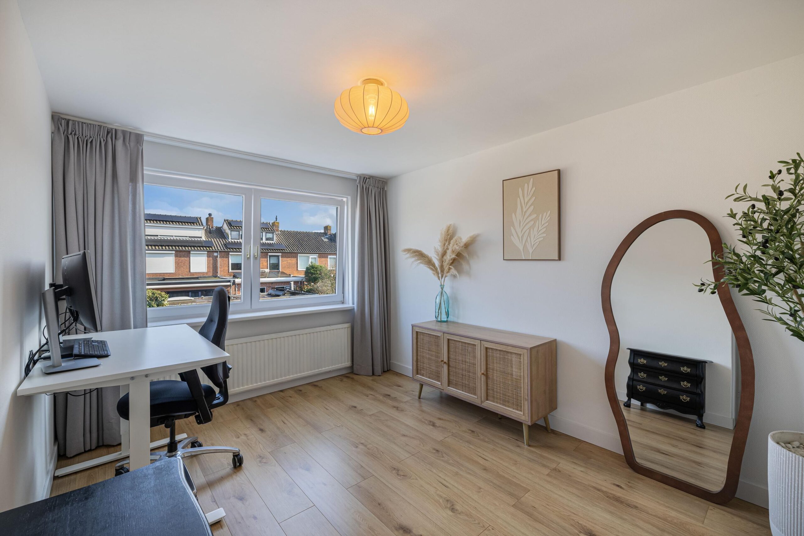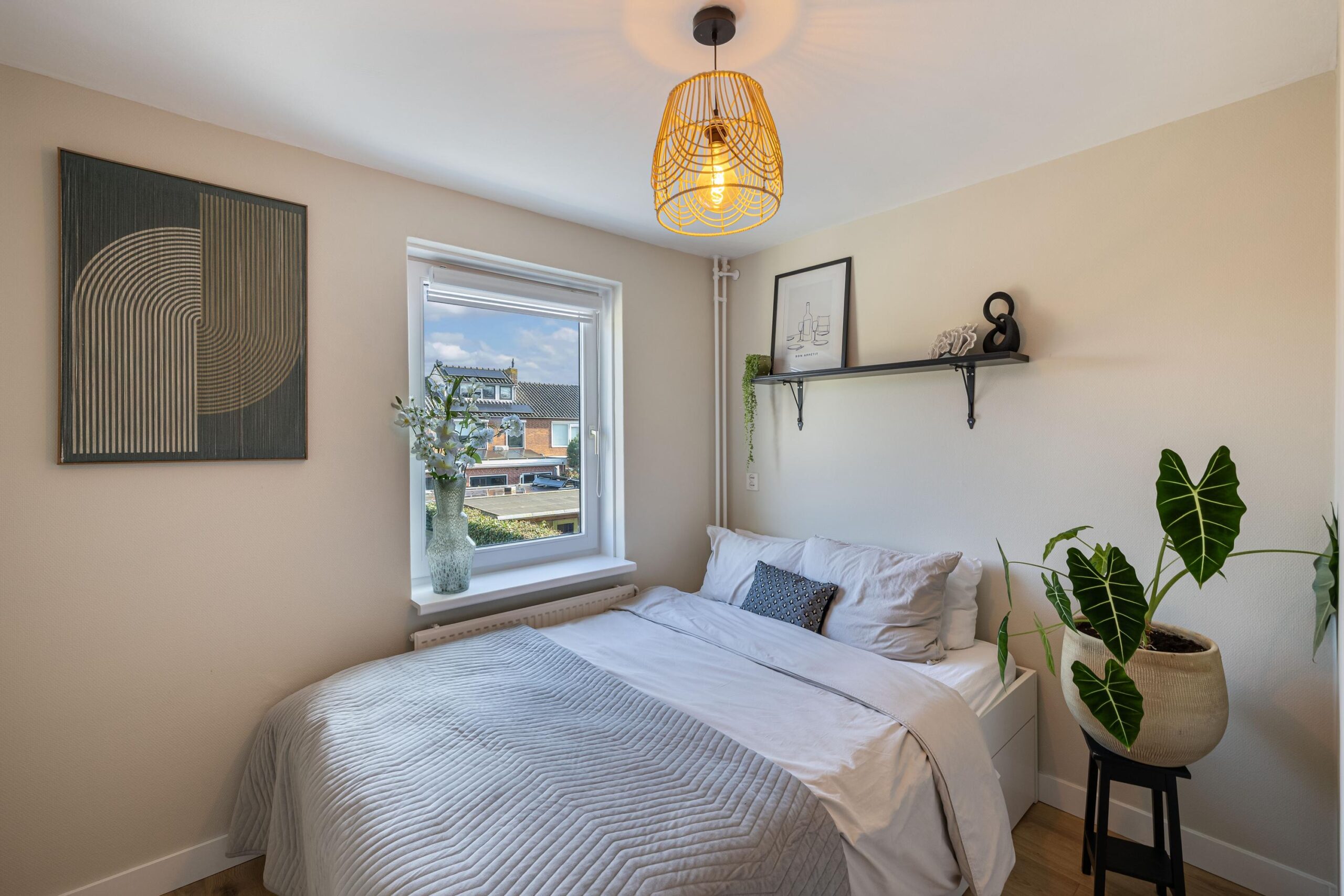 De overloop geeft toegang tot drie goed bemeten slaapkamers. Twee slaapkamers bevinden zich aan de achterzijde van de woning en zijn voorzien van vaste kasten. De ruime slaapkamer aan de voorzijde beschikt eveneens over een vaste kast.