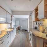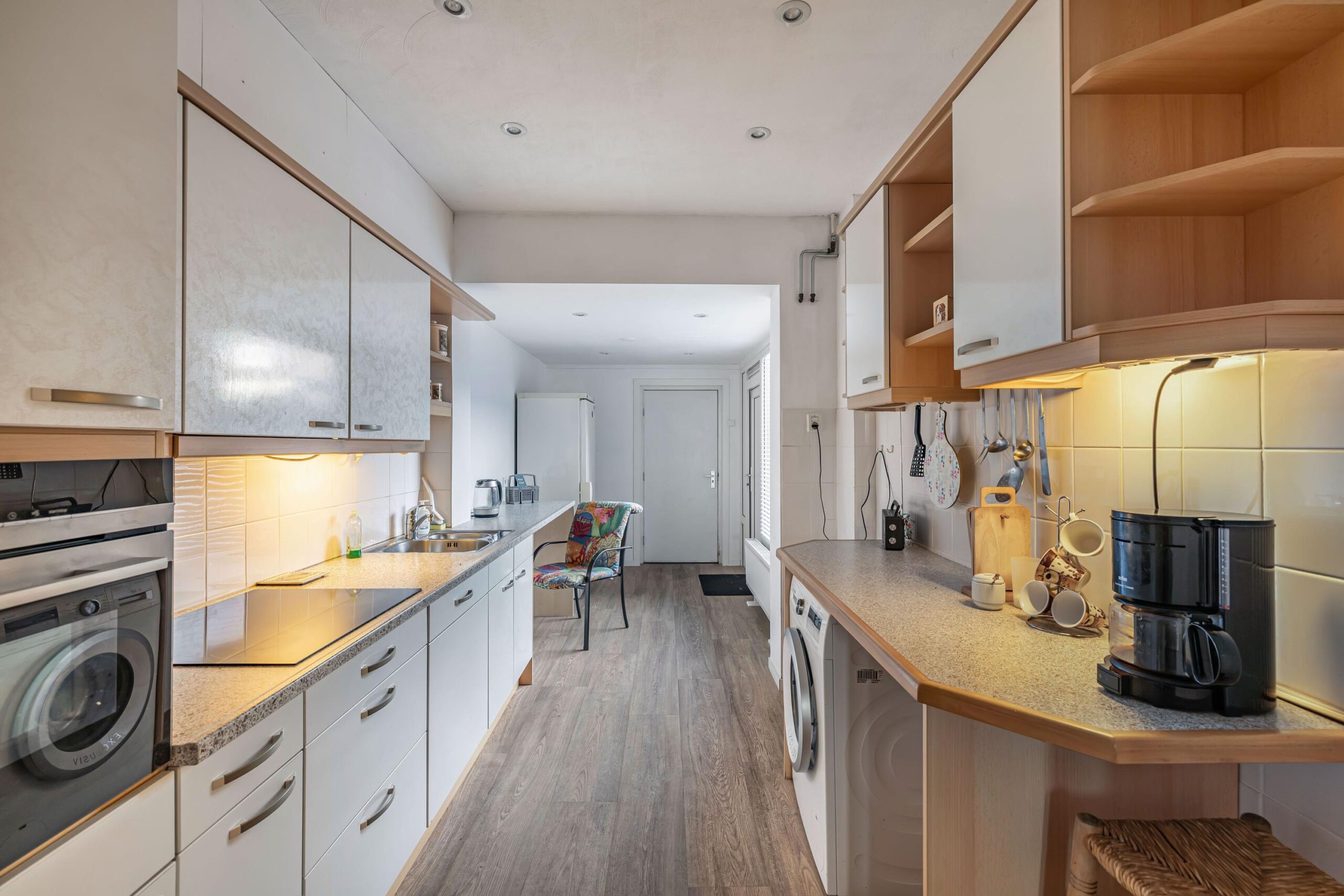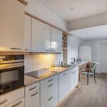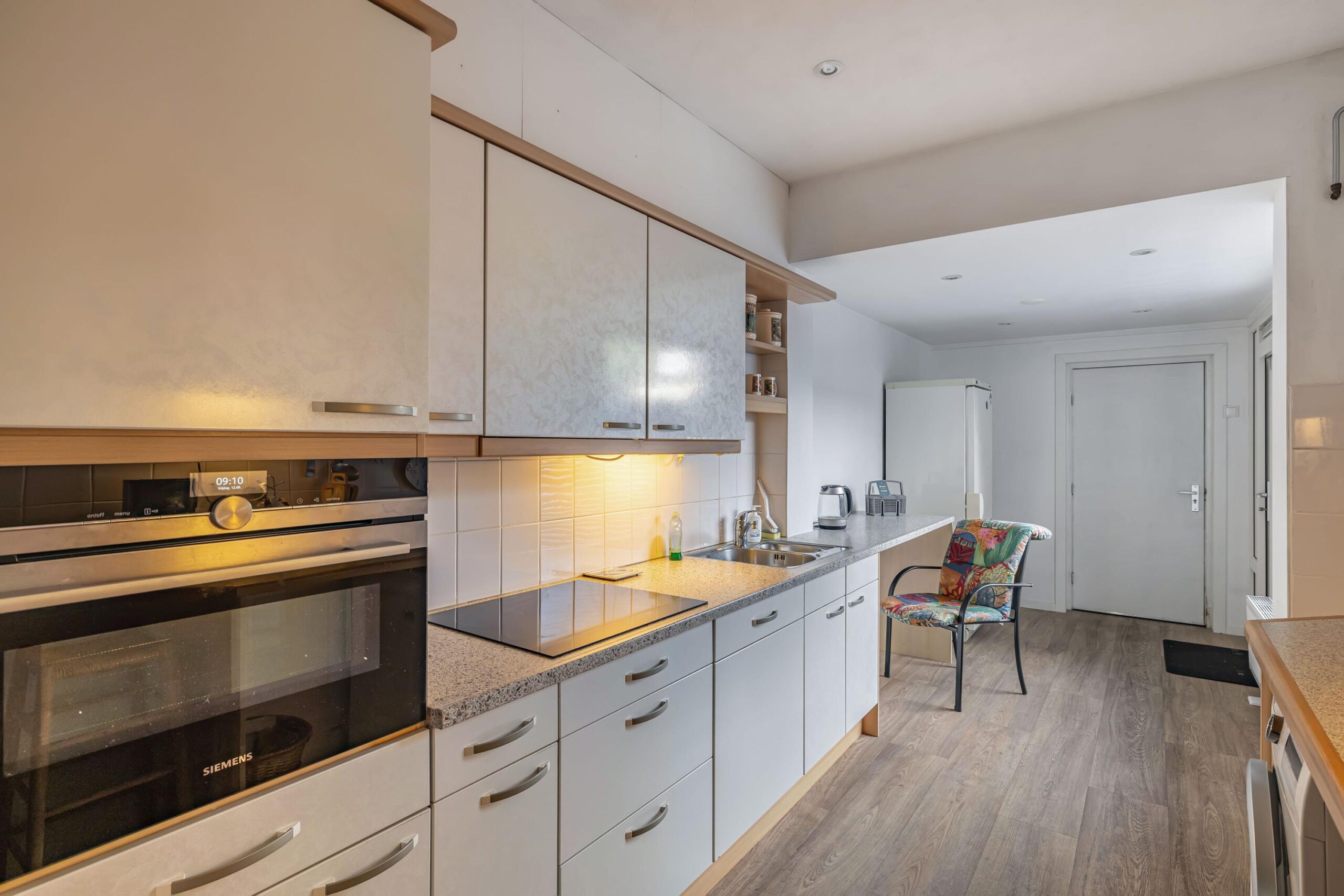 De moderne keuken bevindt zich in een apart gedeeltelijk aan de achterzijde en is voorzien van diverse inbouwapparatuur; kookplaat, afzuigkap, koel-vriescombinatie, combimagnetron en vaatwasser.