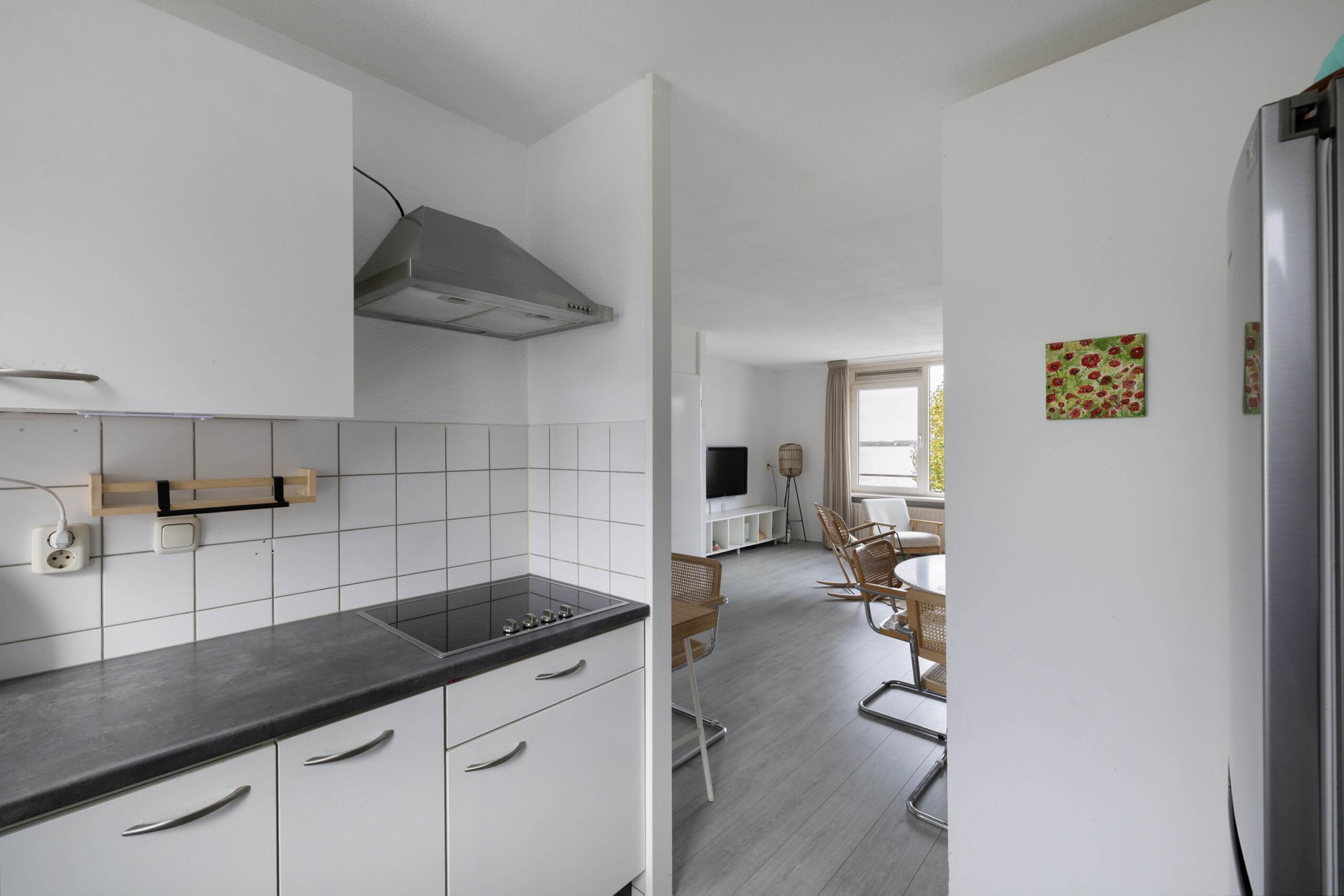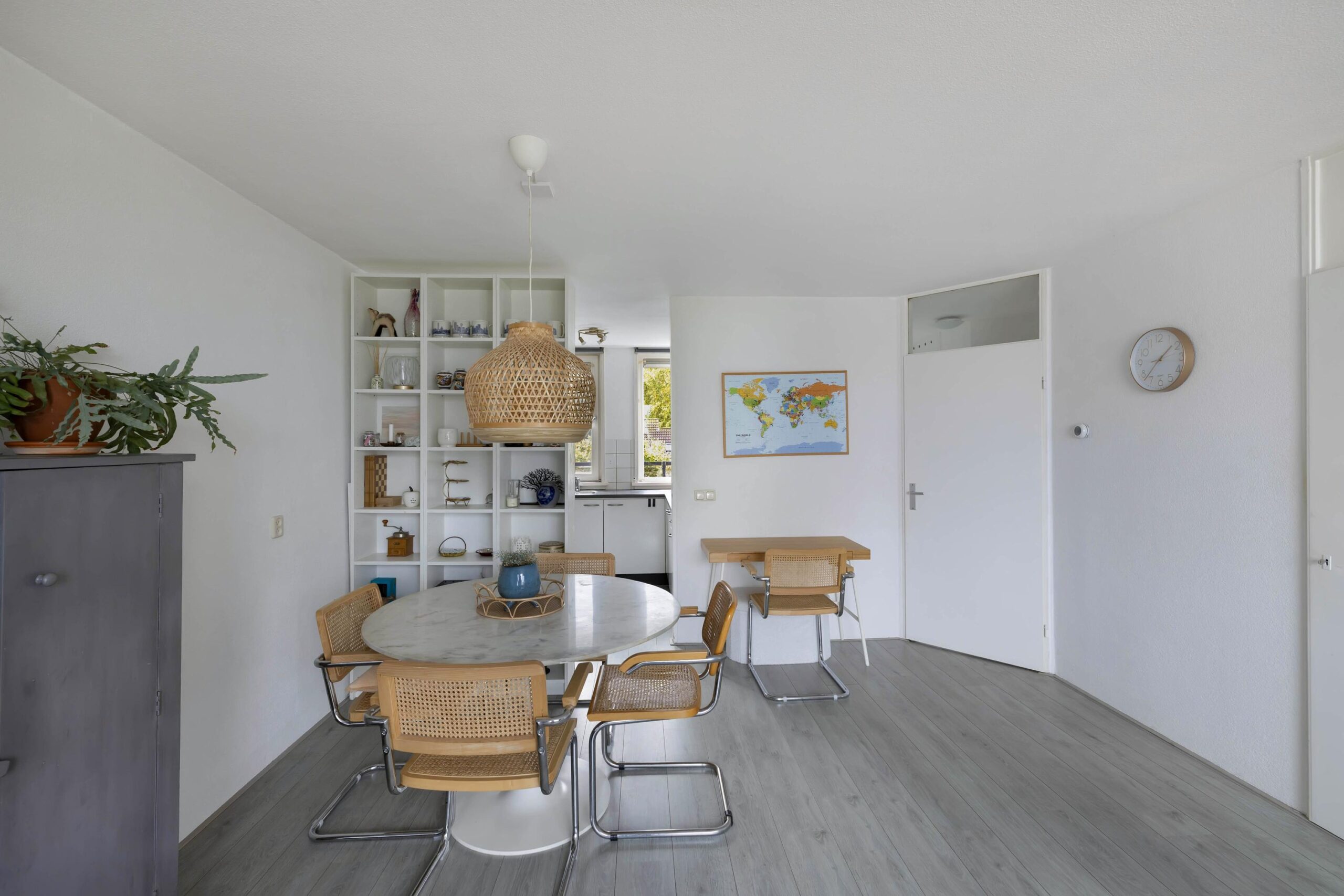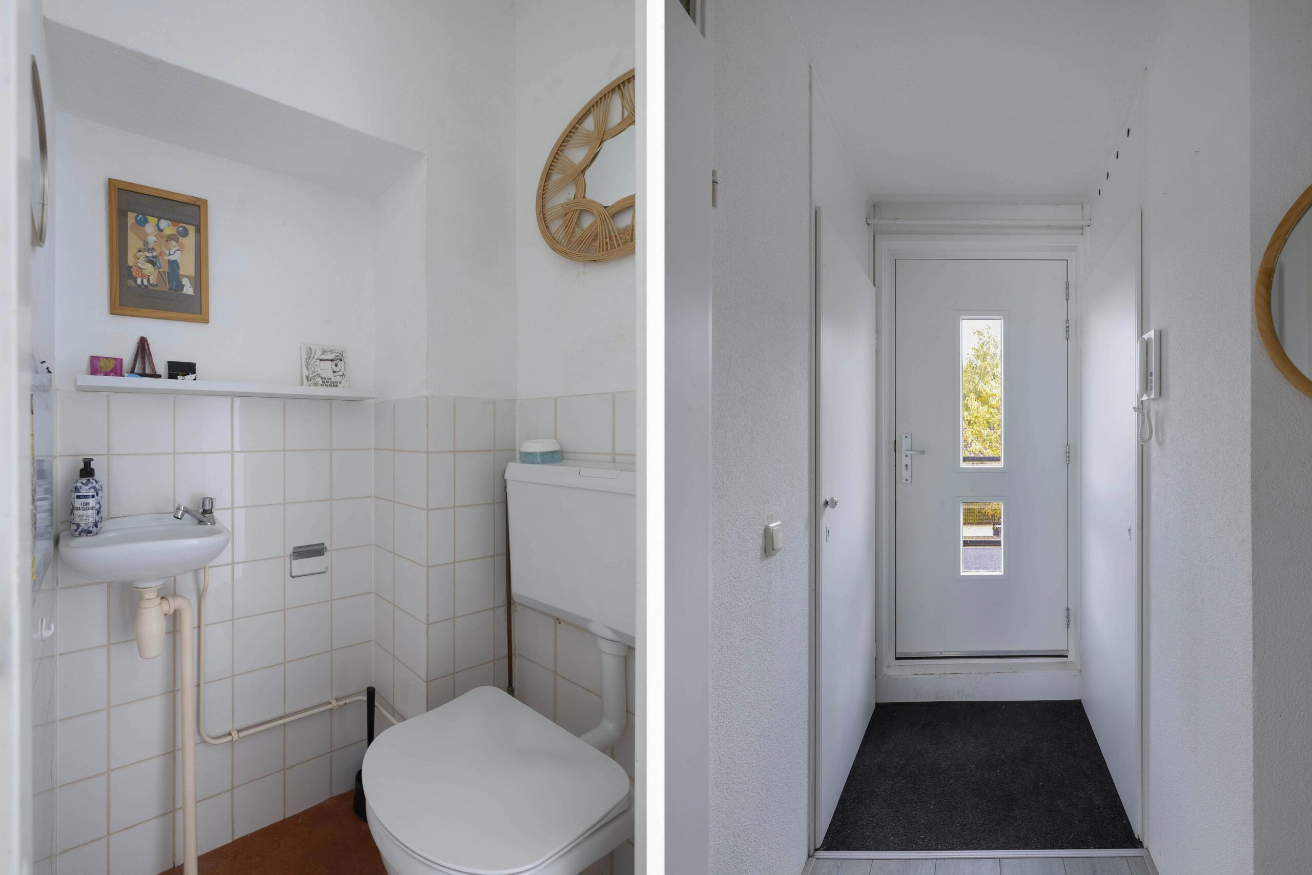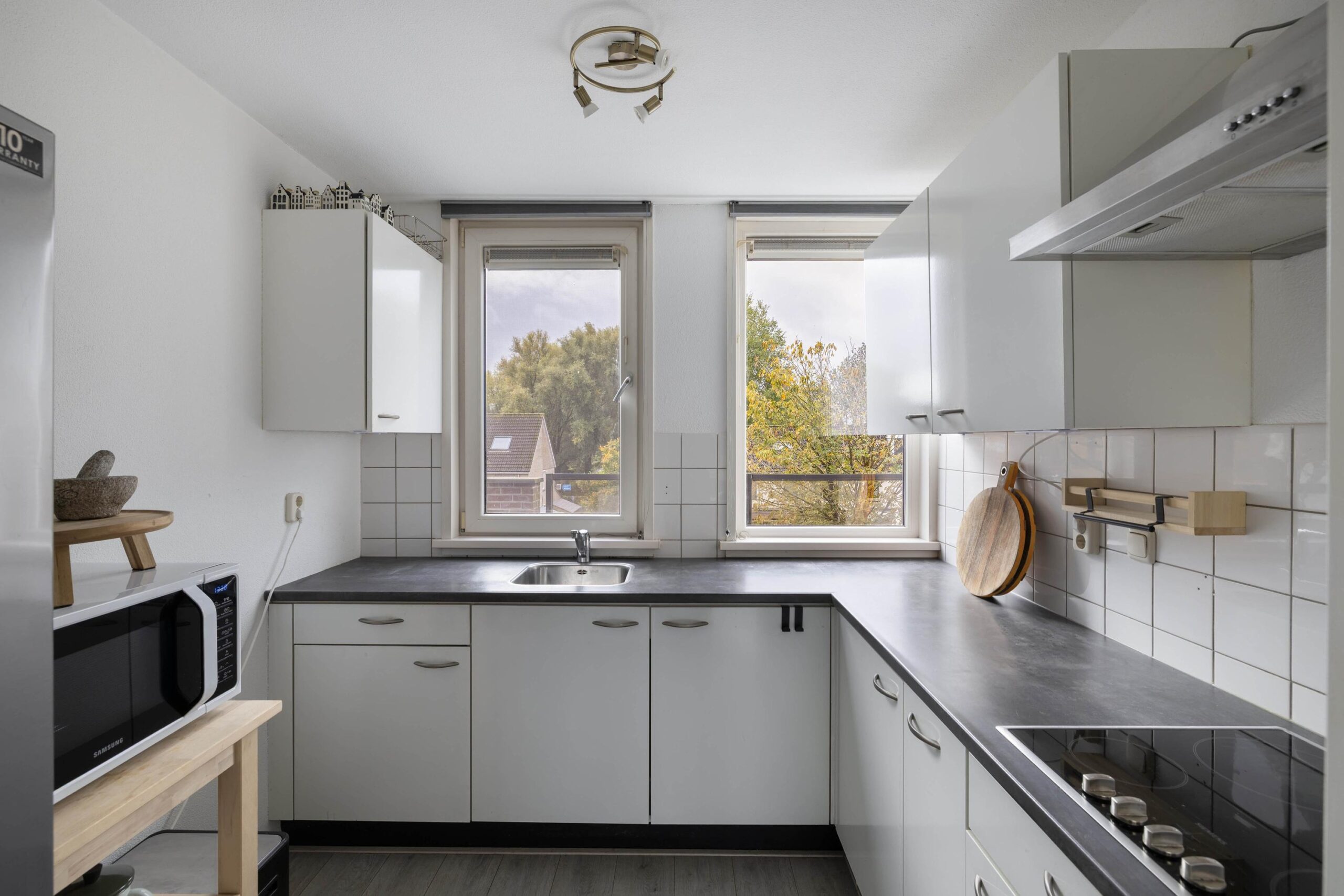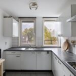 Entree, hal met meterkast en toilet met fonteintje. De lichte woonkamer met vaste kast biedt een fraai uitzicht over het Gooimeer. De halfopen keuken sluit aan op de woonkamer.
