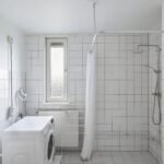 De badkamer is ingericht met een douche, wastafelmeubel en aansluitingen voor wasmachine en droger.