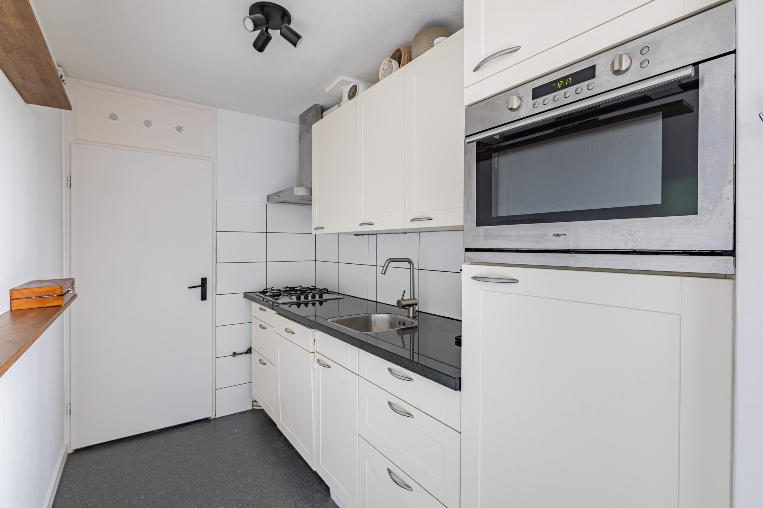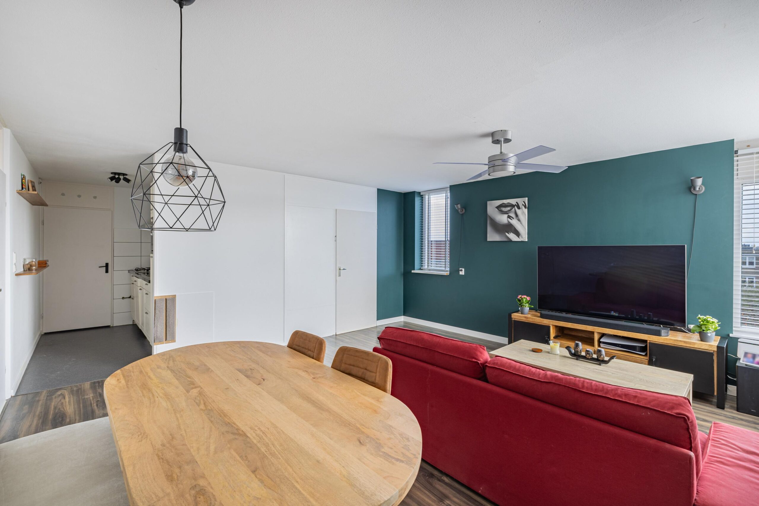 Bij binnenkomst ervaart u direct de prettige sfeer van dit appartement. De ruime, lichte woonkamer biedt volop ruimte voor een zit- en eethoek en heeft grote ramen die zorgen voor veel natuurlijk licht. De halfopen keuken is netjes uitgevoerd en voorzien van diverse inbouwapparatuur, waaronder een gaskookplaat, afzuigkap, koelkast, vaatwasser en een praktische voorraadkast.