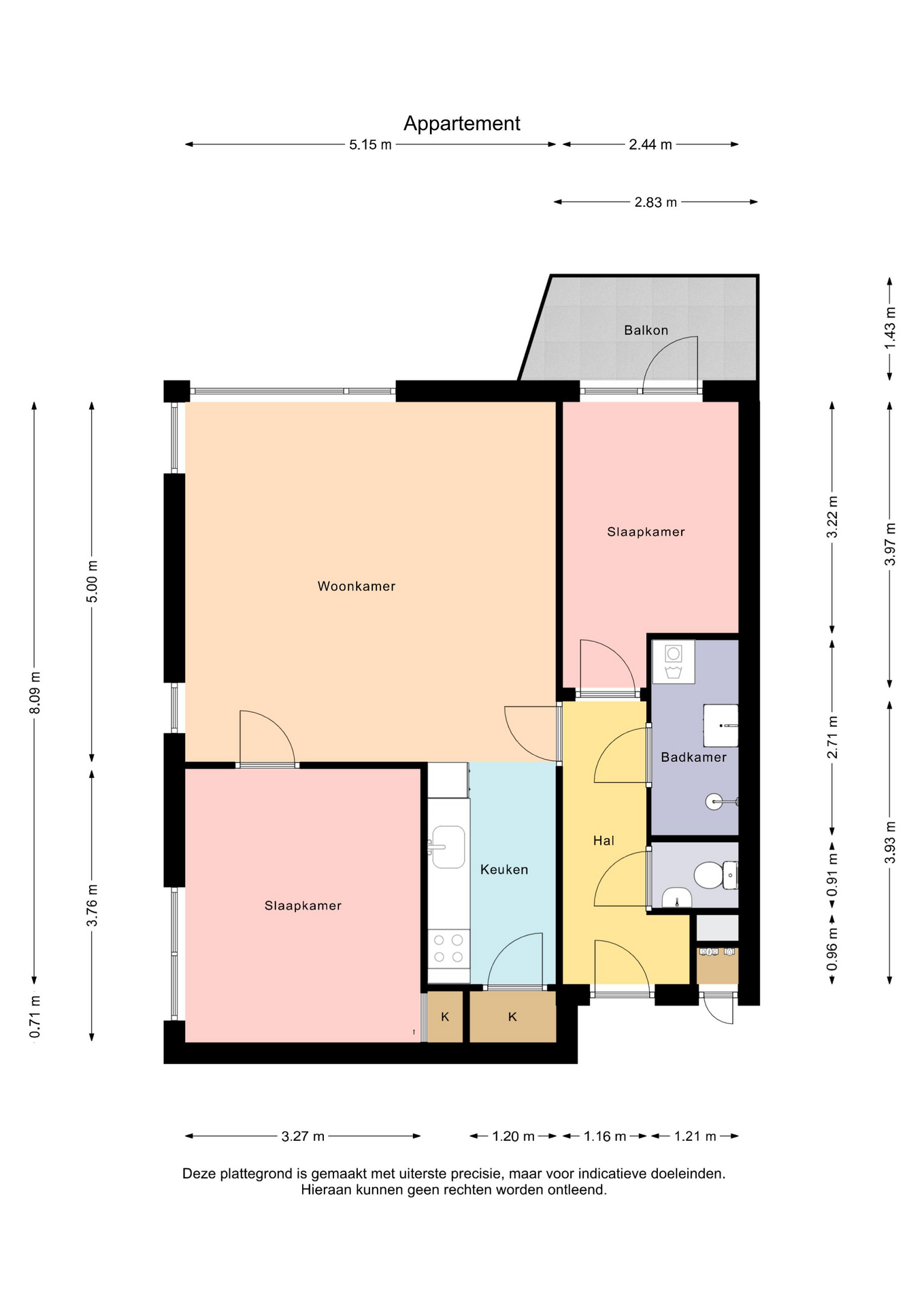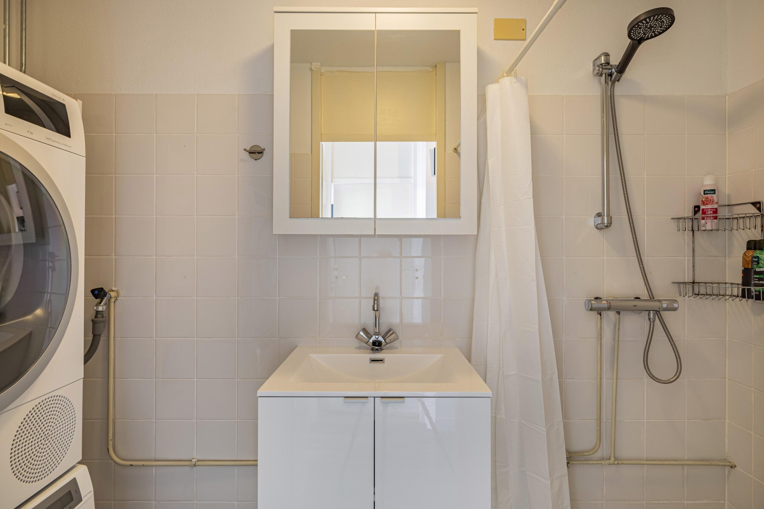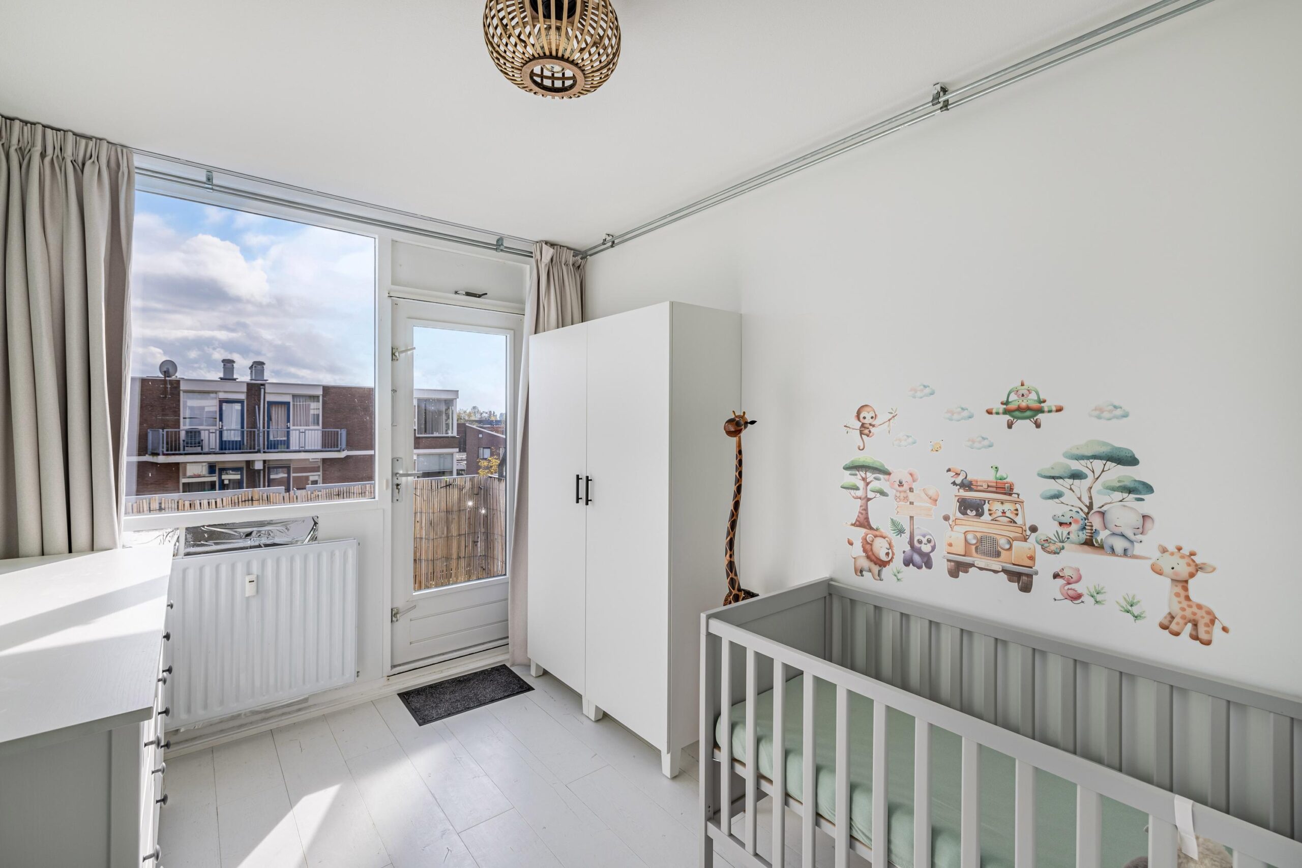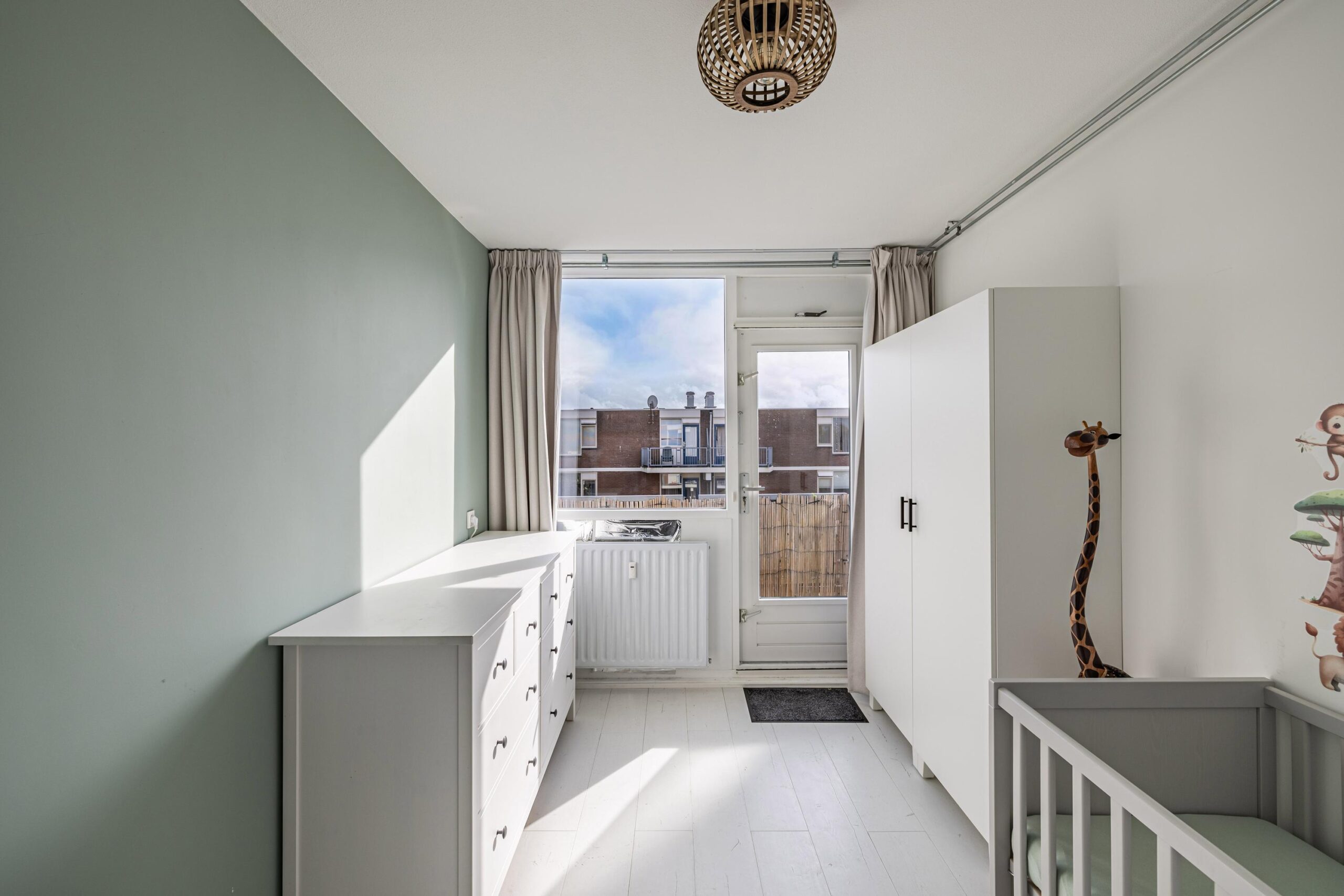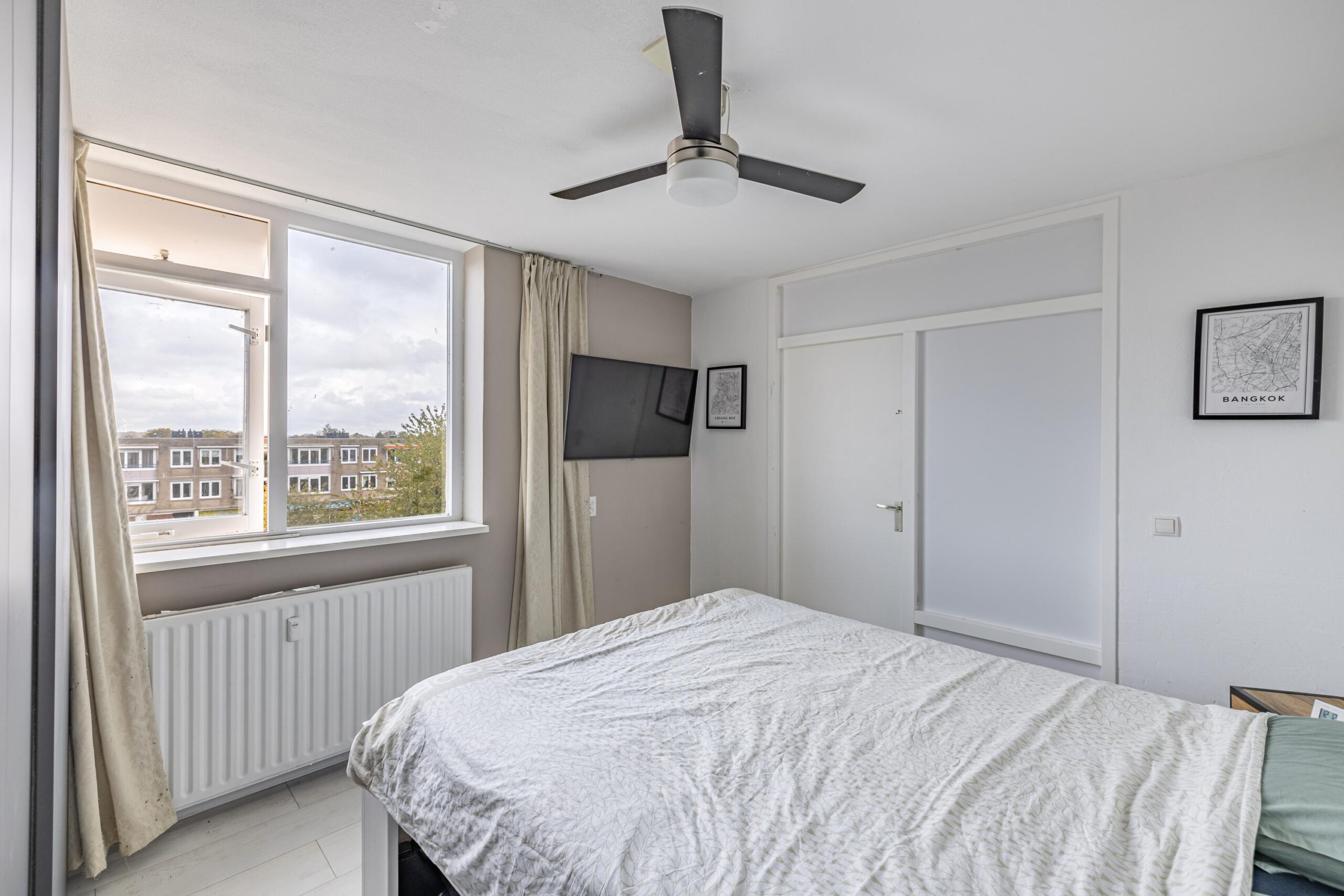 Het appartement beschikt over twee slaapkamers, waarvan één toegang biedt tot het balkon op het zuidoosten. Een fijne plek om van de ochtend- en middagzon te genieten. De badkamer is basic, maar netjes onderhouden en voorzien van een douche, wastafel en aansluiting voor de wasmachine. Daarnaast is er een separaat toilet met fontein en een eigen berging met elektra in de onderbouw.
